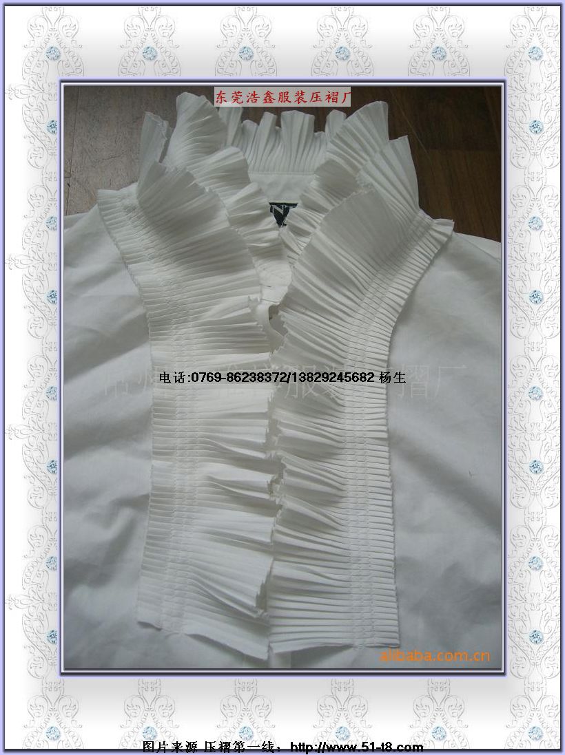 加工种类 机褶:排(百)褶、工字(长城)摺、牙签(水晶)褶、工排混合褶、顺景褶、竹叶褶、(大、中、小)波浪褶,乱景褶、PVC贴合凹凸景、PVC贴合水晶景、PVC贴合KD 刀景、提花褶等数十个压褶品种。 手工褶:太阳摺、太阳排摺、立体褶、乱褶、菠萝褶、直皱褶、鸡爪褶等各种中高档手工褶。 欢迎来样版,均可照样加工生产。 工厂加工质优价廉,供货及时,欢迎各界来函、来电咨询洽谈!